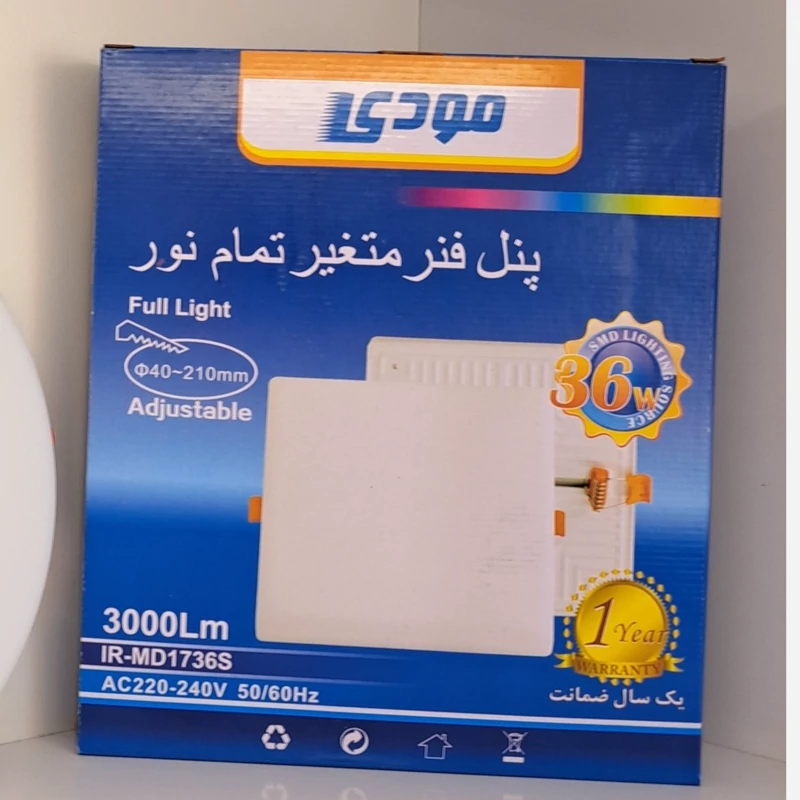 پنل تمام فریم 36 وات مودی بسیار باکیفیت و دارای علامت استاندارد میباشد. از ویژگی متمایز این محصول قابلیت سایز شو بودن گیره های پنل برای قرار گرفتن داخل سقف است. با این قابلیت حفره های 4 تا 21 سانت را پوشش میدهد. ابعاد 25x27x10 سانتیمتر وزن 250 گرم فرم طراحی دایره جنس محافظ پلاستیک طول عمر مفید 25000 ساعت