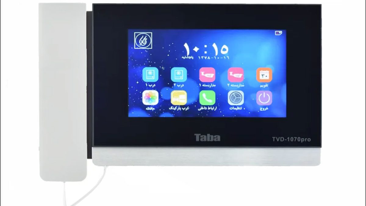 آیفون تصویری تابا مدل 1070 پرو دارای صفحه نمایش 7 اینچی تمام لمسی رنگی با قابلیت پشتیبانی از حافظه داخلی و کارت حافظه است. این دستگاه مجهز به ارتباط داخلی (دوخط)، رله خروجی مجزا برای باز کردن درب پارکینگ یا فراخوان آسانسور و قابلیت اتصال به دو پنل زنگ و دو دوربین امنیتی است. همچنین، دارای قابلیت عکسبرداری و فیلمبرداری و منو فارسی می باشد.